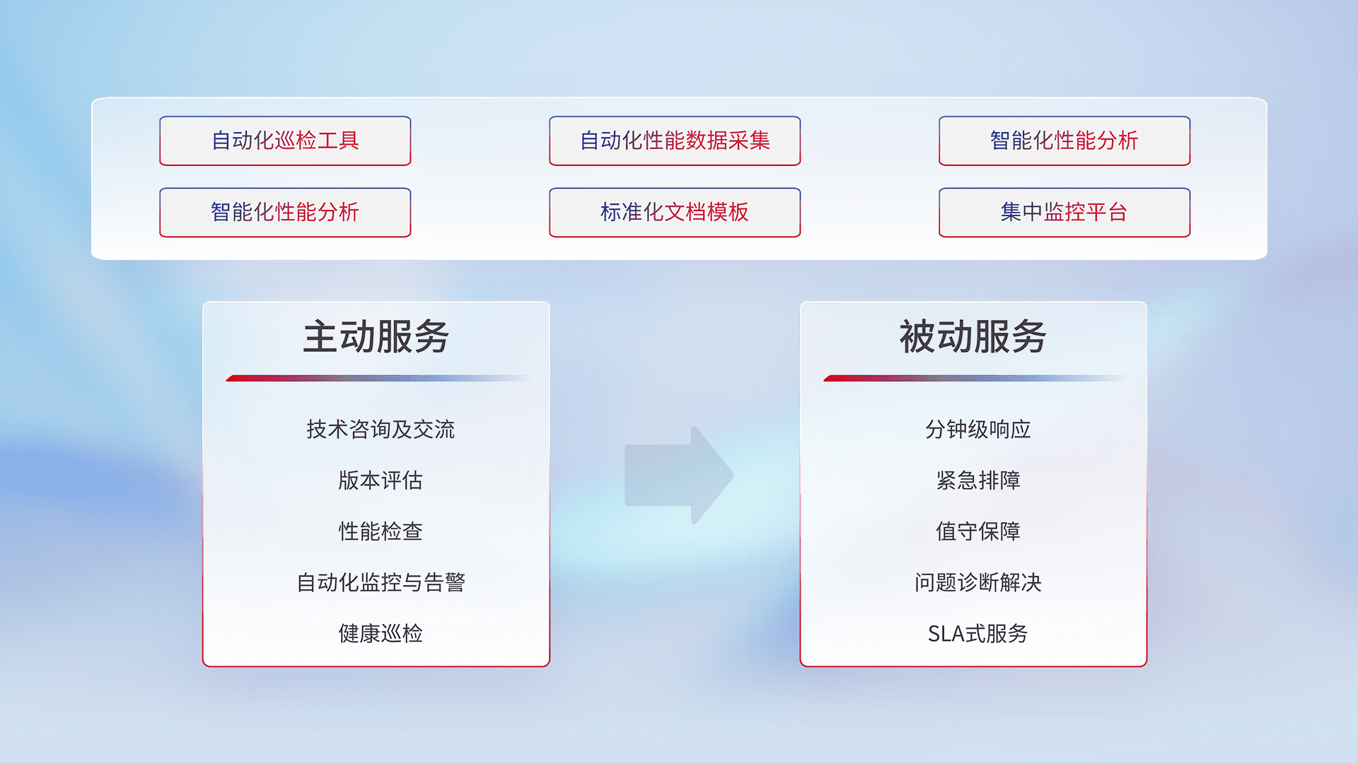 智能化工具和标准化文档,,,,保障服务质量,,提供主动服务(包含技术咨询、、、、版本评估、、性能检查、、、自动化监控与告警、、健康巡检)和被动服务包含(分钟级响应、、、紧急排障、、、值守保障、、问题诊断解决、、、SLA服务)。。。